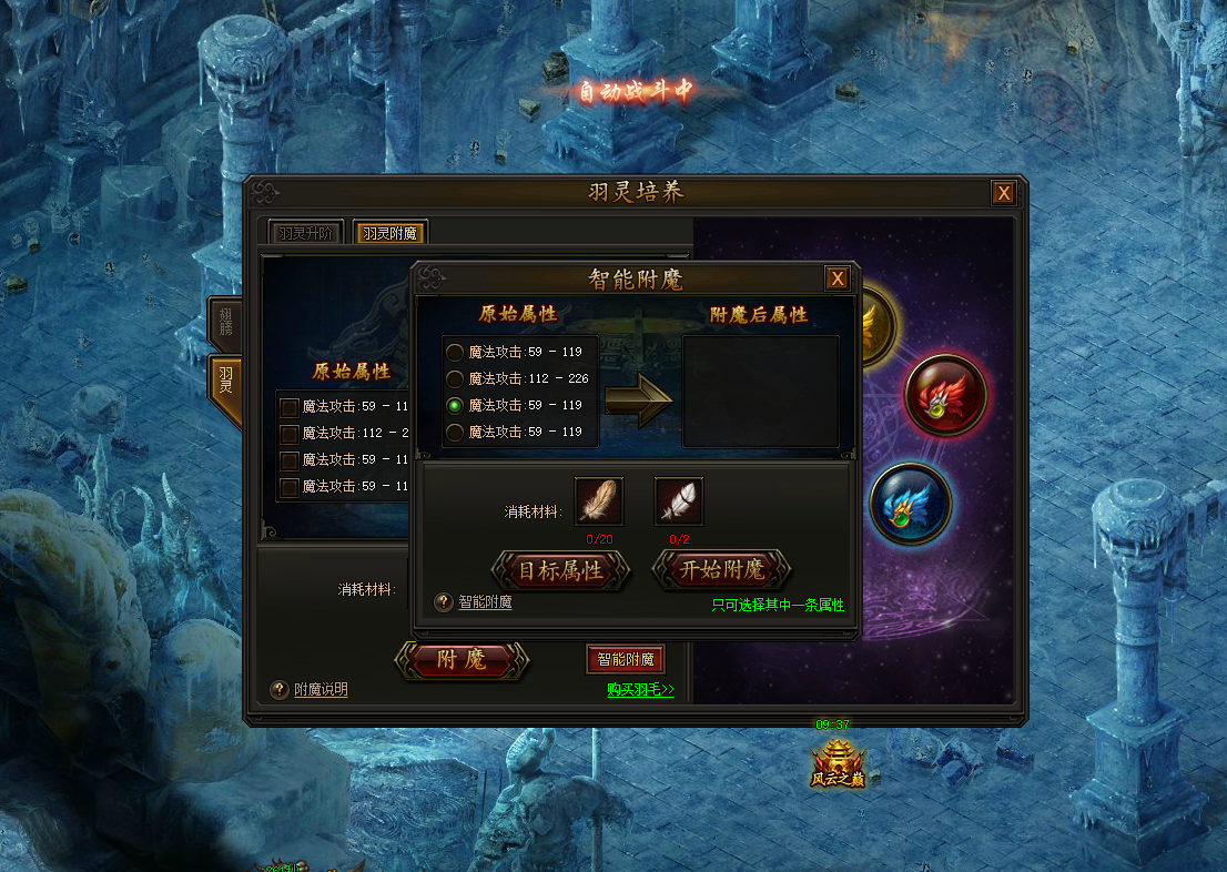 一月份的更新后出了智能附魔的系统。首先我们在附魔页面点击智能附魔。然后先选择自己的原始属性,比如魔法攻击59-119,然后选择目标属性。这个目标属性的话就是最大的属性,在智能附魔的时候他会向着这个方向附魔,只要出现了币自己现在攻击高的魔法攻击属性就会自己替换,材料够的情况下会一直洗到魔法攻击330-665。咱们的老区玩家这个系统没有满级的,也可以直接点击最高的攻击属性,或者生命上限2%,就可以不必管他了,让他自己洗!