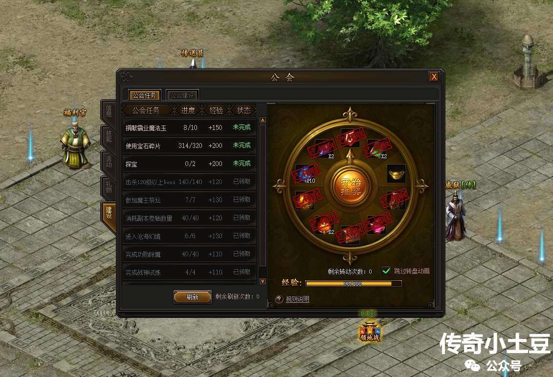 传奇霸业开服30天的时候开启公会建设系统。点开系统后左侧是公会任务,完成任务即可获得抽奖次数,在右侧的转盘抽奖。转盘上面一共有10个道具奖励,全部抽完后即可刷新奖励。奖励的材料也比较多,其中可以获得公会物资箱,吃掉后可以获得个人物资额度和公会物资额度。